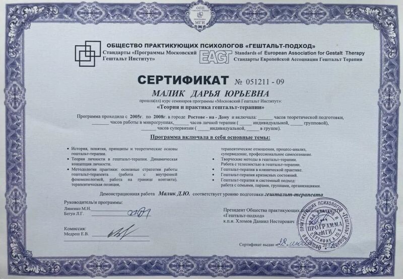 - Московский Гештальт Институт, Гештальт, 180 часов, 2005–2008 гг.