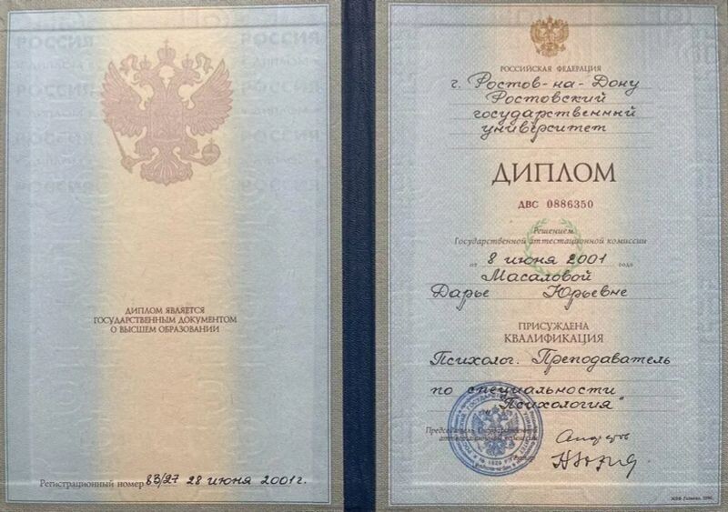 - Ростовский Государственный Университет, Психолог, 1996–2001 гг.