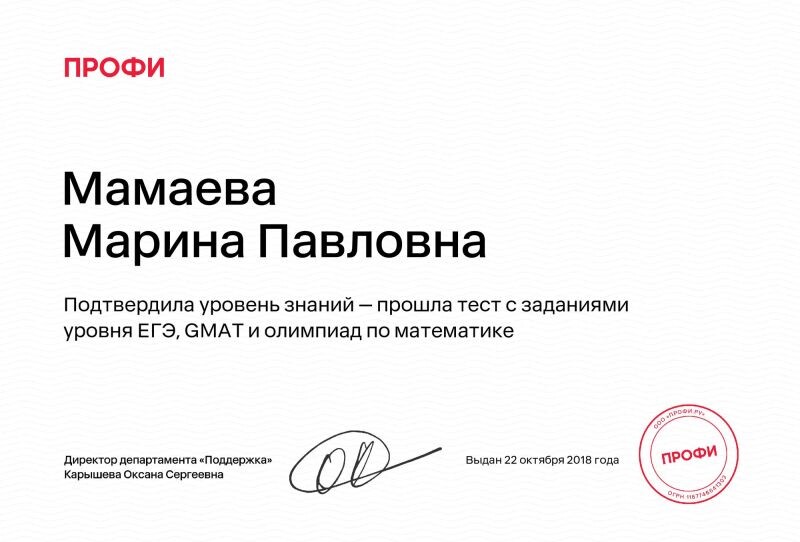 Марина Павловна - замечательный преподаватель. Благодаря ей мой ребенок поступил в профильный класс математической школы. Она ясно, четко и без перебора рассказывала материал. За несколько занятий мы освоили олимпиадную математику, необходимую для поступления.