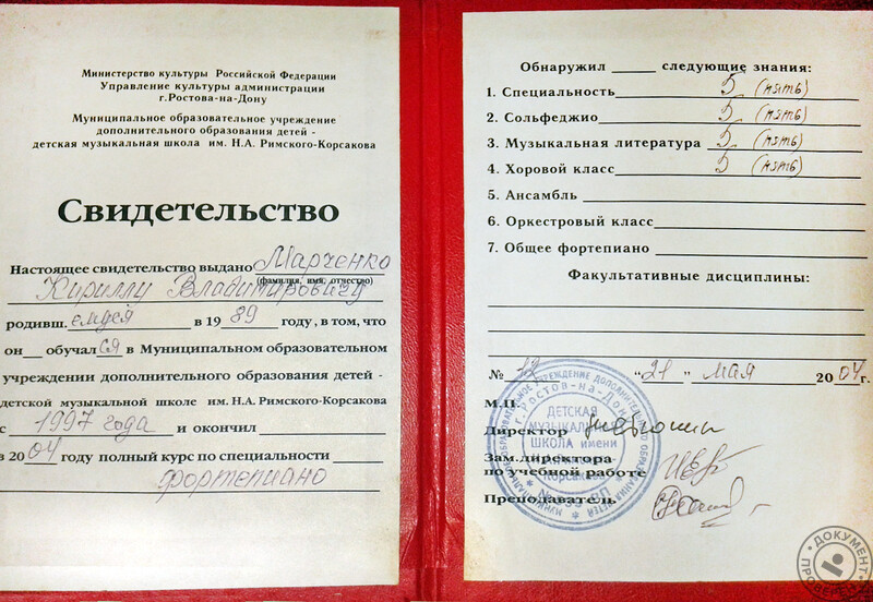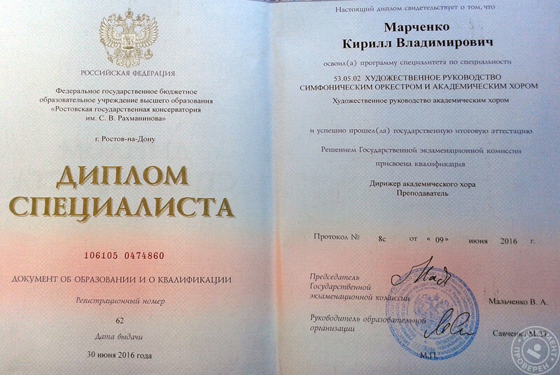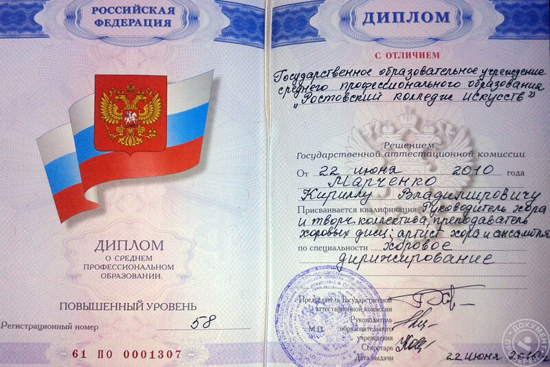 - Ростовский колледж искусств, отделение дирижирования академическим хором (2010 г.).
