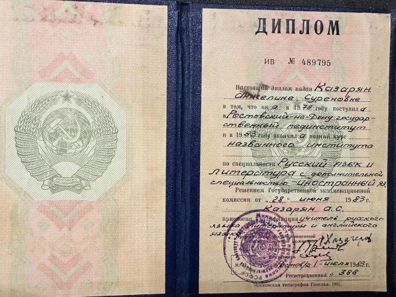 - Ростовский-на-Дону государственный пединститут, специальность «русский язык и литература», дополнительная специальность «иностранный язык», квалификация «учитель русского языка, литературы и английского языка», 1978–1983 гг.
