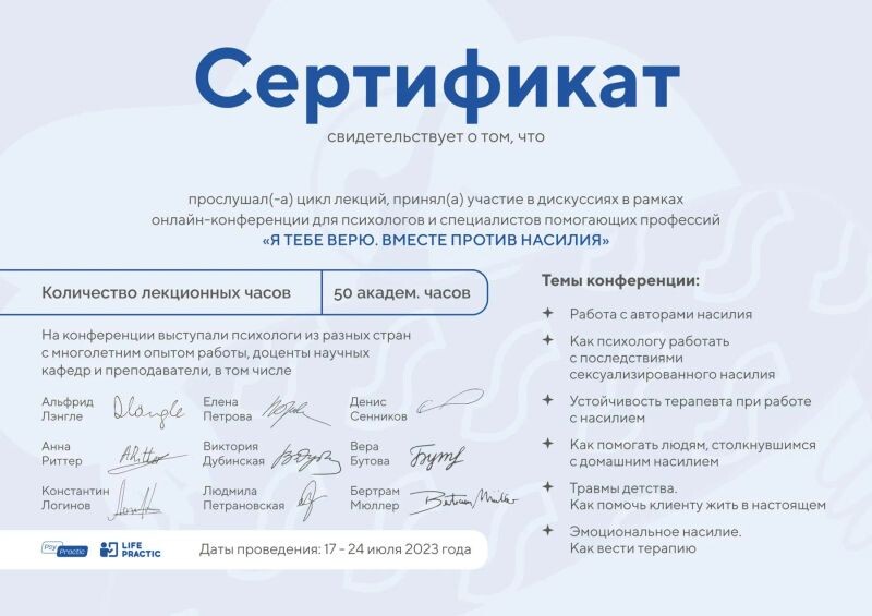 - Онлайн-конференция для психологов и специалистов помогающих профессий «Я тебе верю. Вместе против насилия», 2023 г.