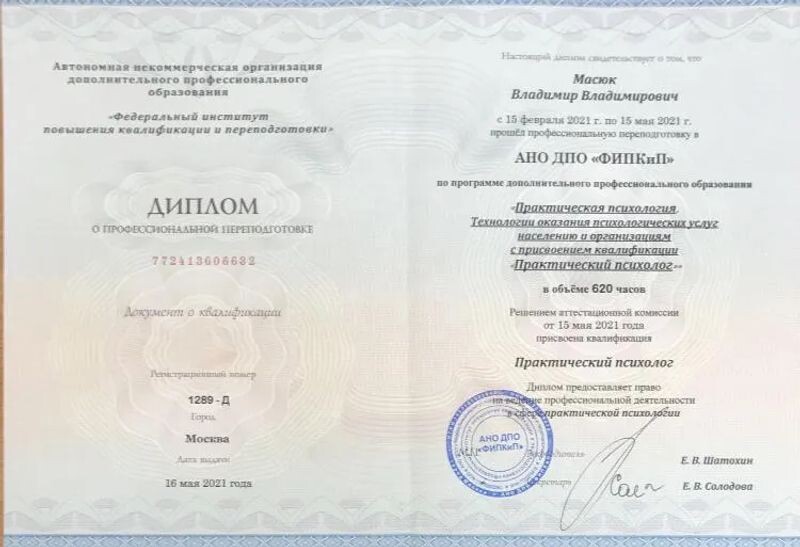 - Федеральный институт повышения квалификации и переподготовки, практическая психология, 2021 г.