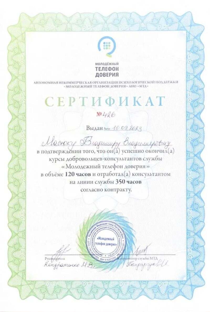 - АНОПП «Молодёжный телефон доверия», курсы добровольцев-консультантов службы «Молодёжный телефон доверия», 2023 г.