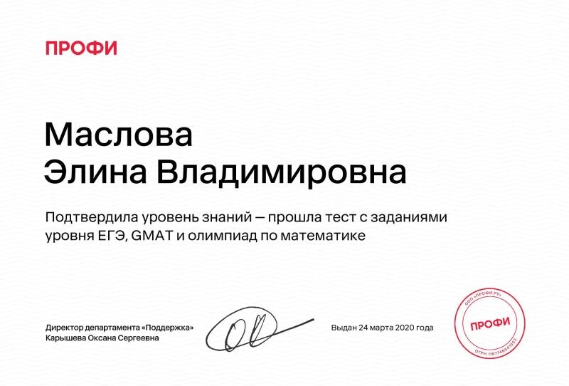- Подтвердила уровень знаний — Прошла тест с заданиями уровня ЕГЭ, GMAT и олимпиад по математике (с 2020 г.).