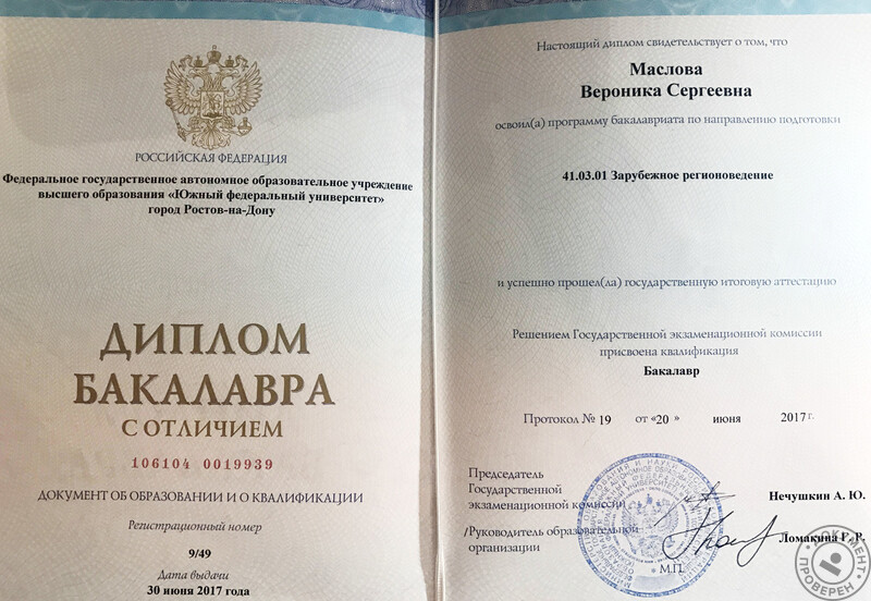 - Южный федеральный университет, факультет зарубежного регионоведения, направление – зарубежное регионоведение, диплом бакалавра с отличием (2017 г.).