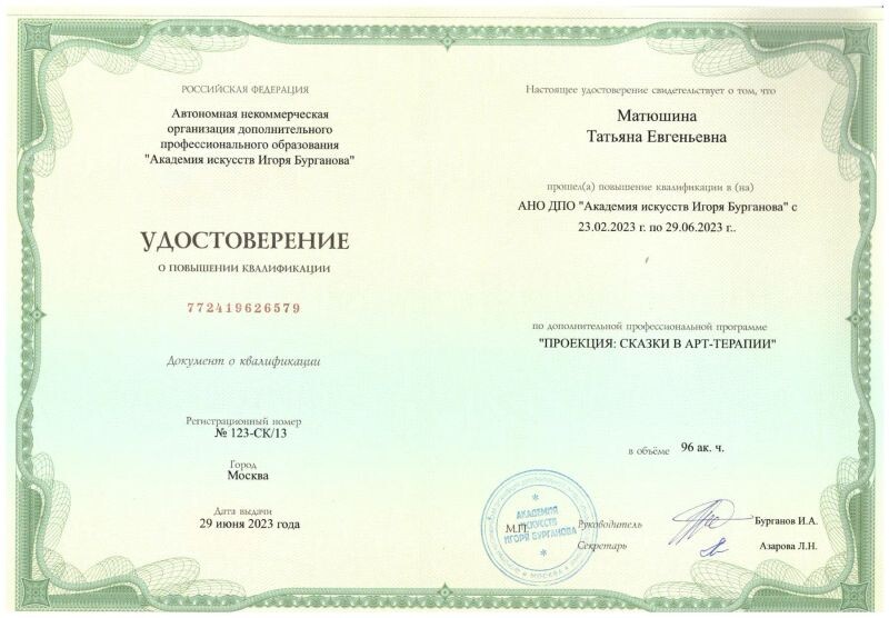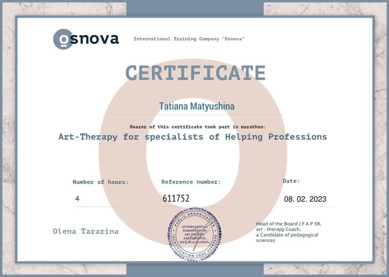 - Институт психотерапии и клинической психологии, программа «Практические технологии арт-терапии в работе с различной проблематикой», 2023 г.