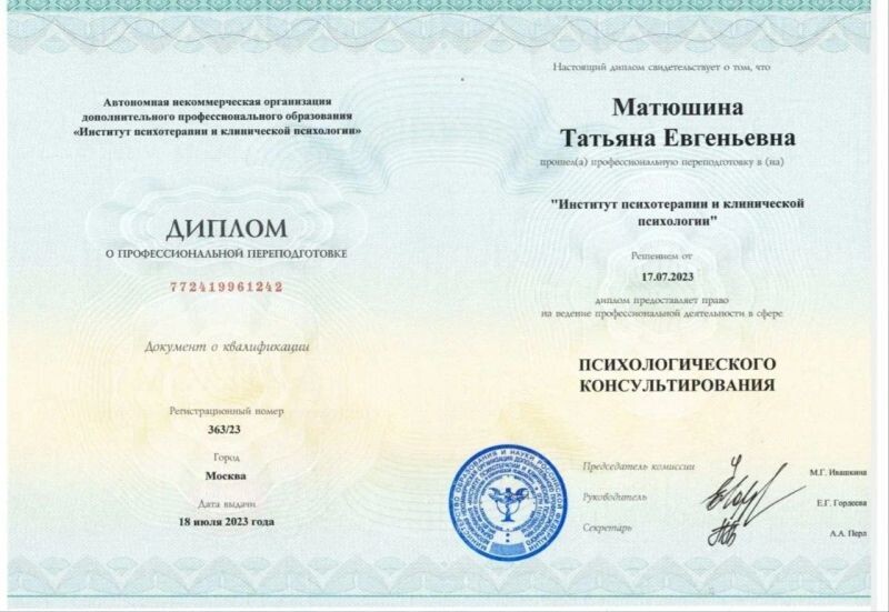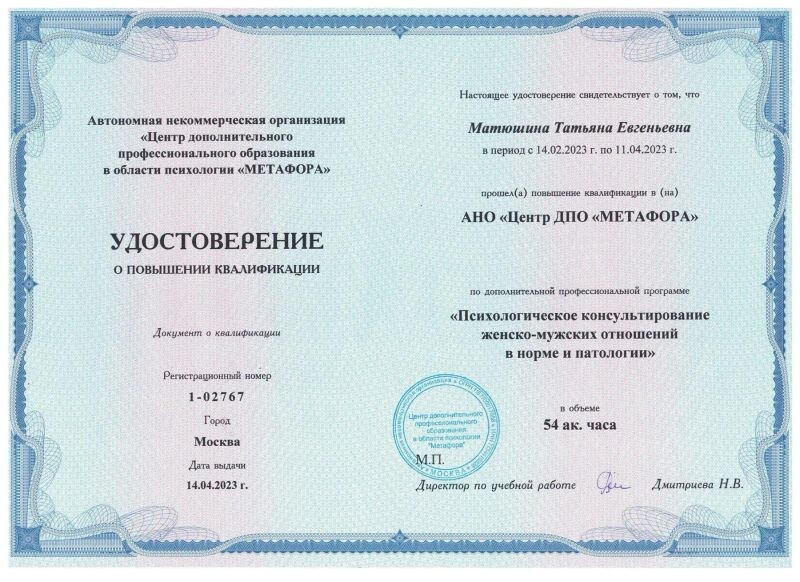 - Институт «Метафора», программа «Психологическое консультирование женско-мужских отношений в норме и патологии», 2023 г.
