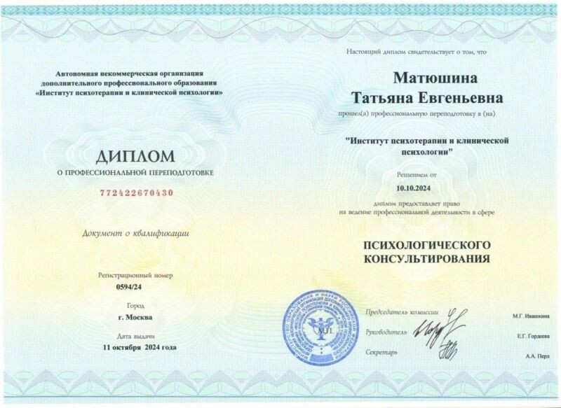 - Институт психотерапии и клинической психологии, программа «Транзактный анализ: теория и практика», 2024 г.