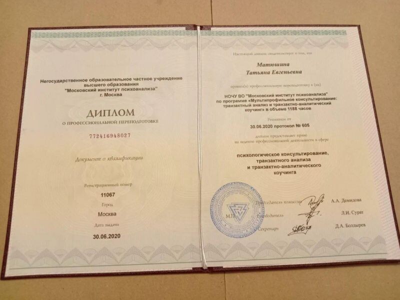 - Московский институт психоанализа, мультипрофильное консультирование, транзактный анализ и транзактно-аналитический коучинг, 2019–2020 гг.