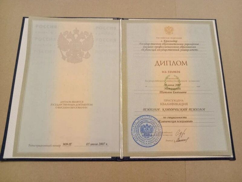 - Кубанский государственный университет, Клинический психолог, 2001–2007 гг.
