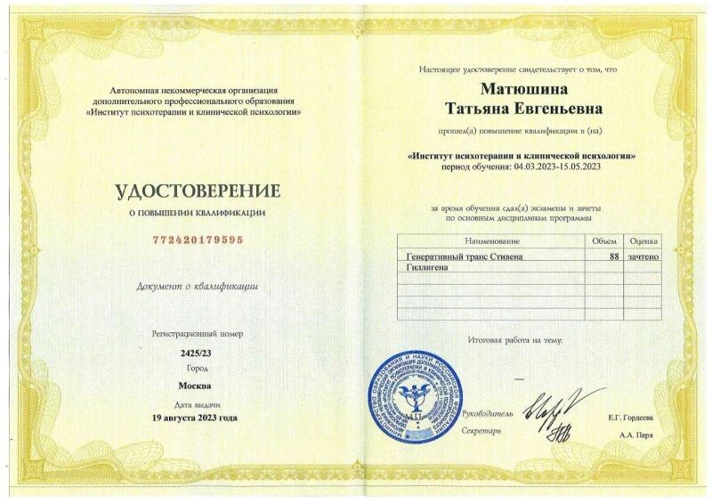 - Институт психотерапии и клинической психологии, программа «Генеративный транс Стивена Гиллегана», 2023 г.