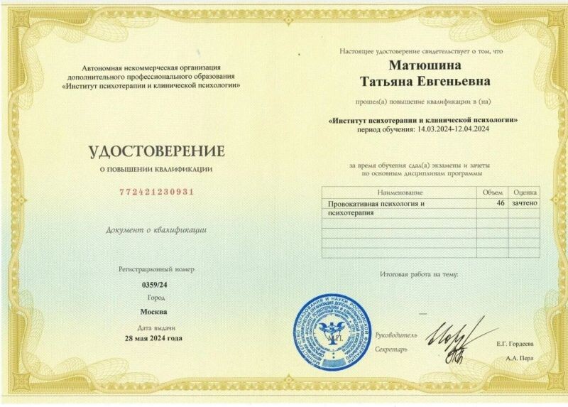 - Институт психотерапии и психологии, программа «Провокативная психология и психотерапия», 2024 г.