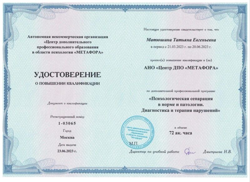 - Институт «Метафора», программа «Психологическая сепарация в норме и патологии: диагностика и терапия нарушений», 2023 г.