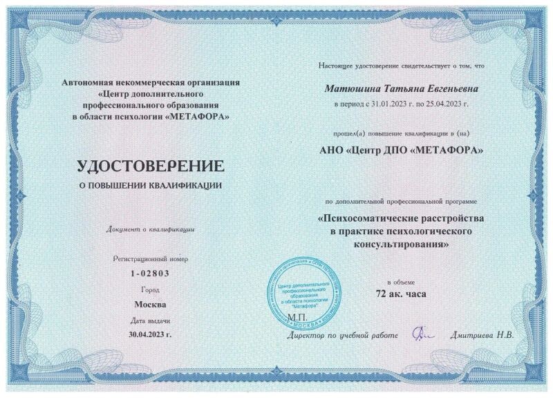 - Институт «Метафора», программа «Психосоматические расстройства в практике психологического консультирования», 2023 г.