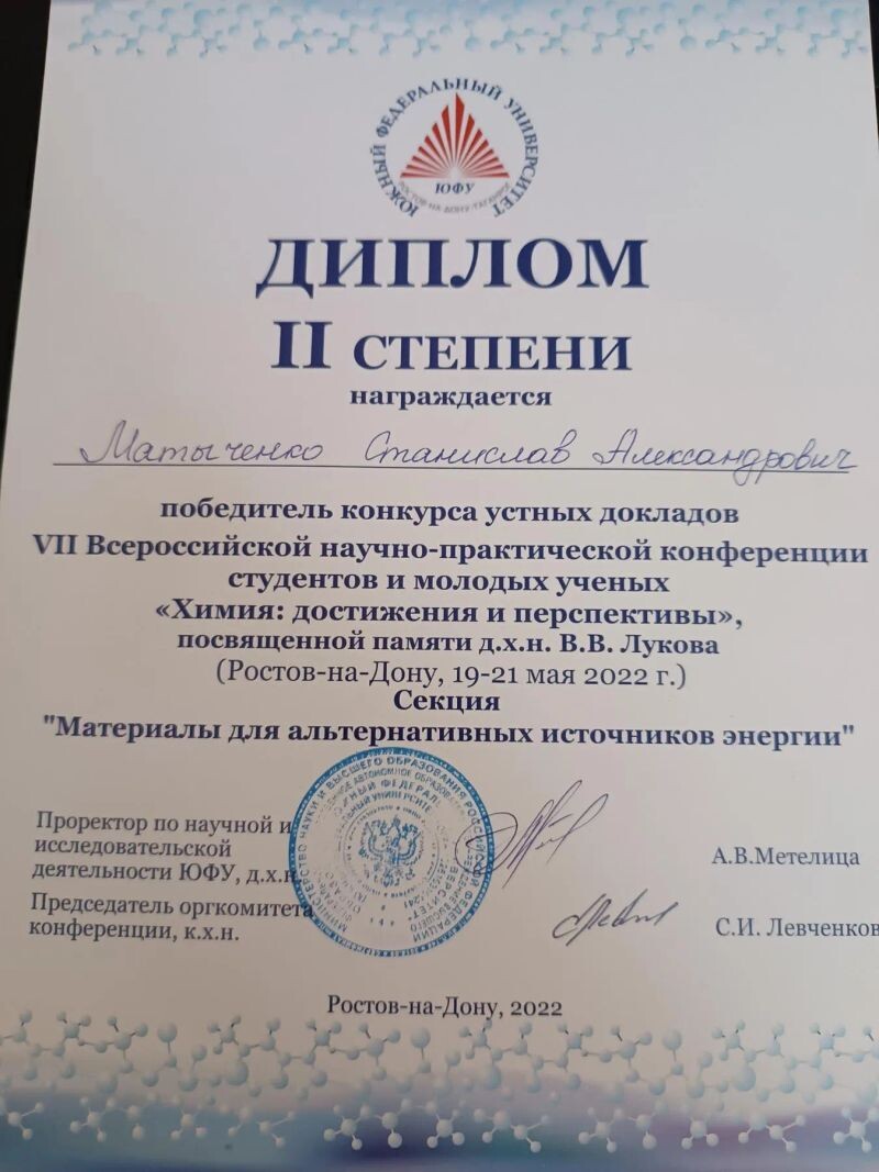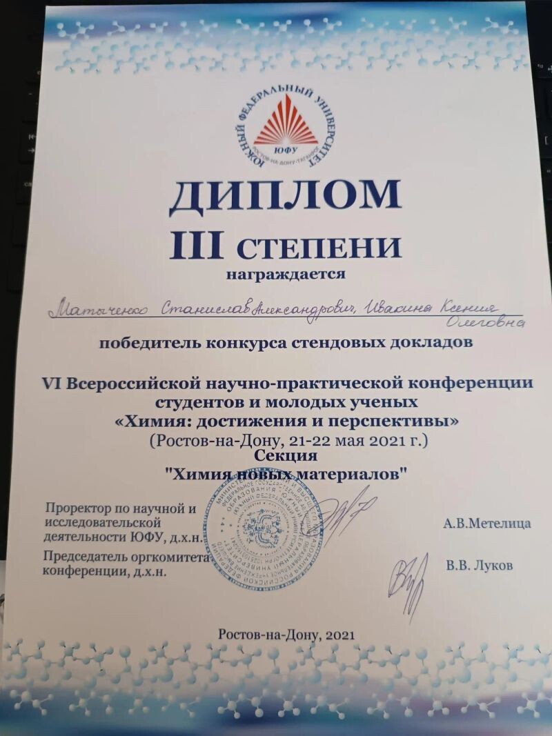 - ЮФУ, химический факультет, фундаментальная и прикладная химия (с 2019 г.).