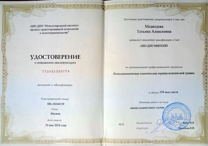 - Международный институт процесс-ориентированной психологии и психотравматологии, психодинамическая соматическая терапия психической травмы, 2022–2024 гг.