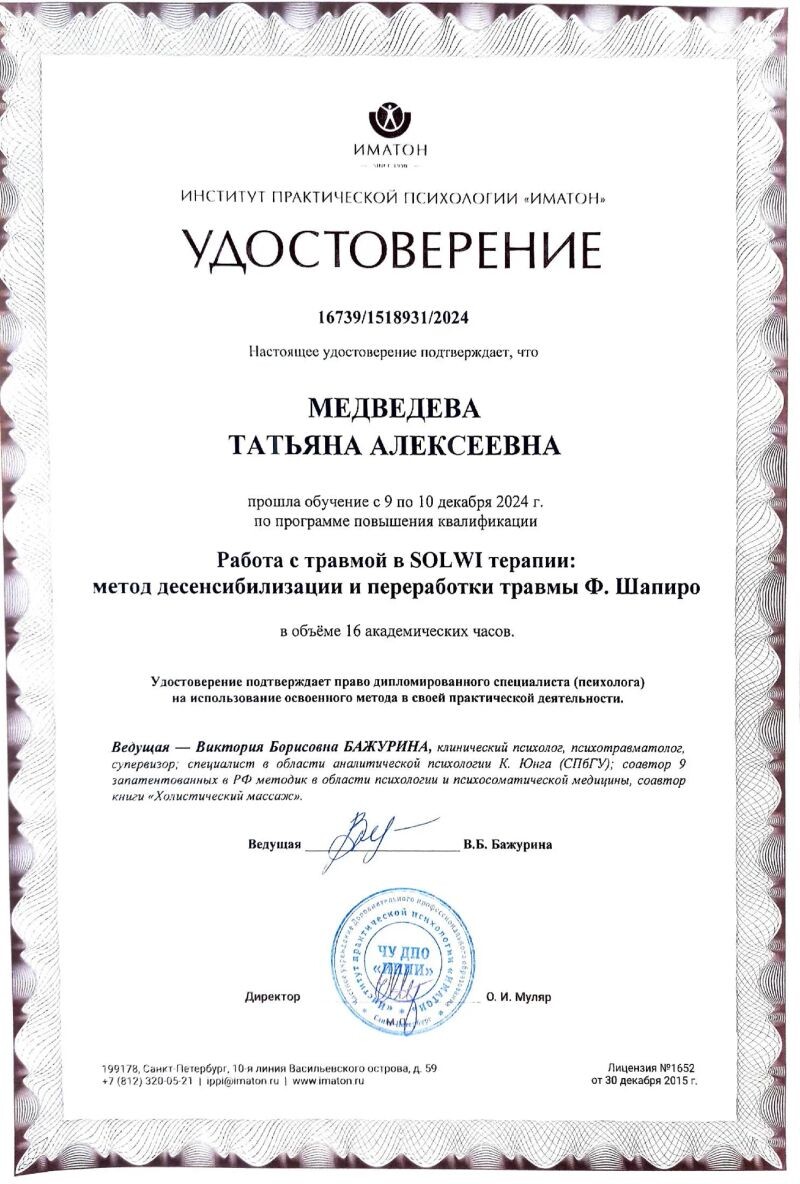- Институт практической психологии «Иматон», работа с травмой в SOLWI терапии, метод десенсибилизации и переработки травмы Ф. Шапиро, 2024 г.