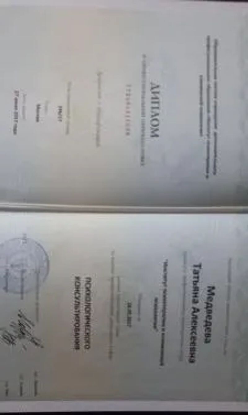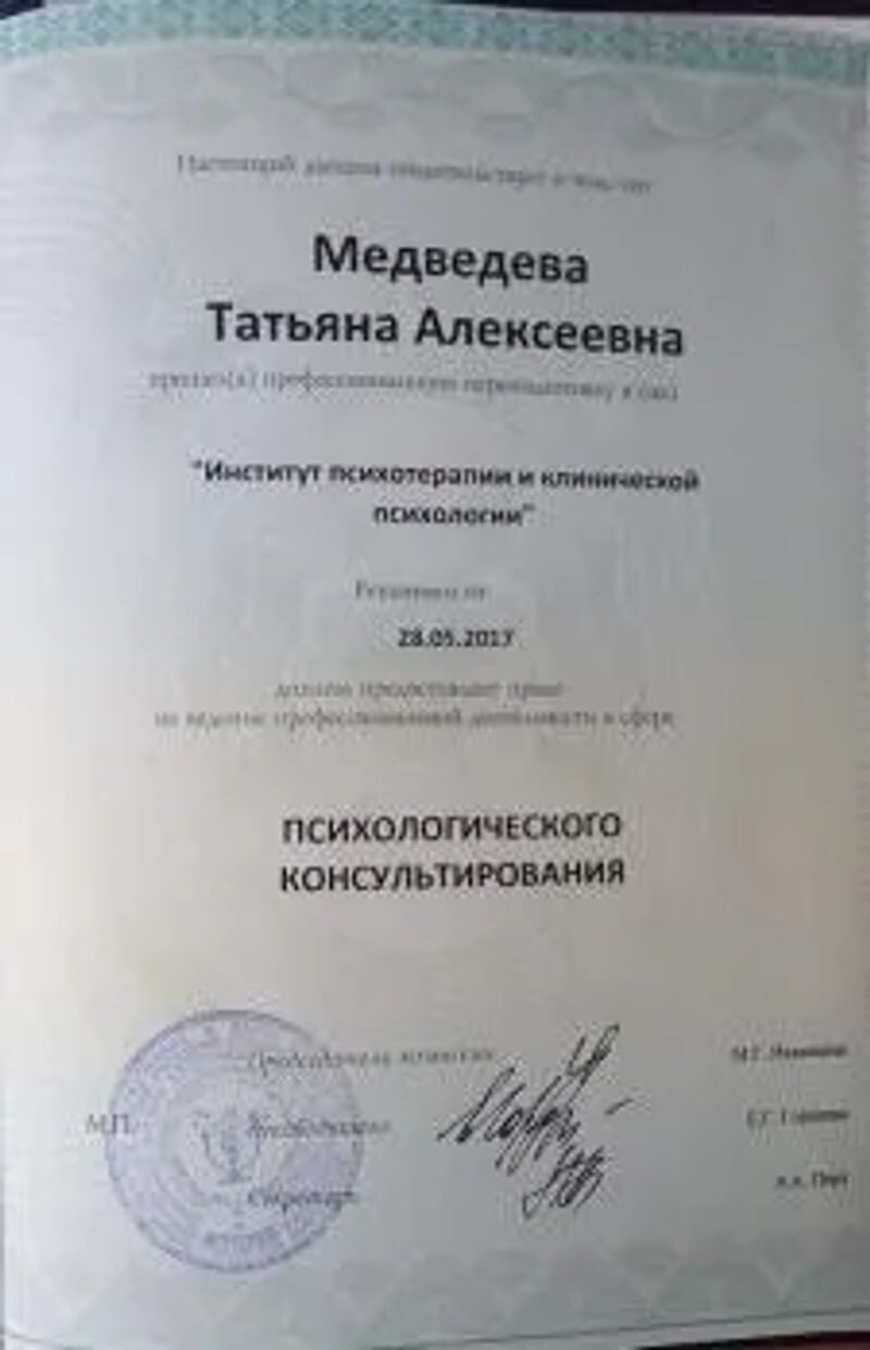 - ОЧУДПО «Институт психотерапии и клинической психологии», психологическое консультирование, 2015–2017 гг.