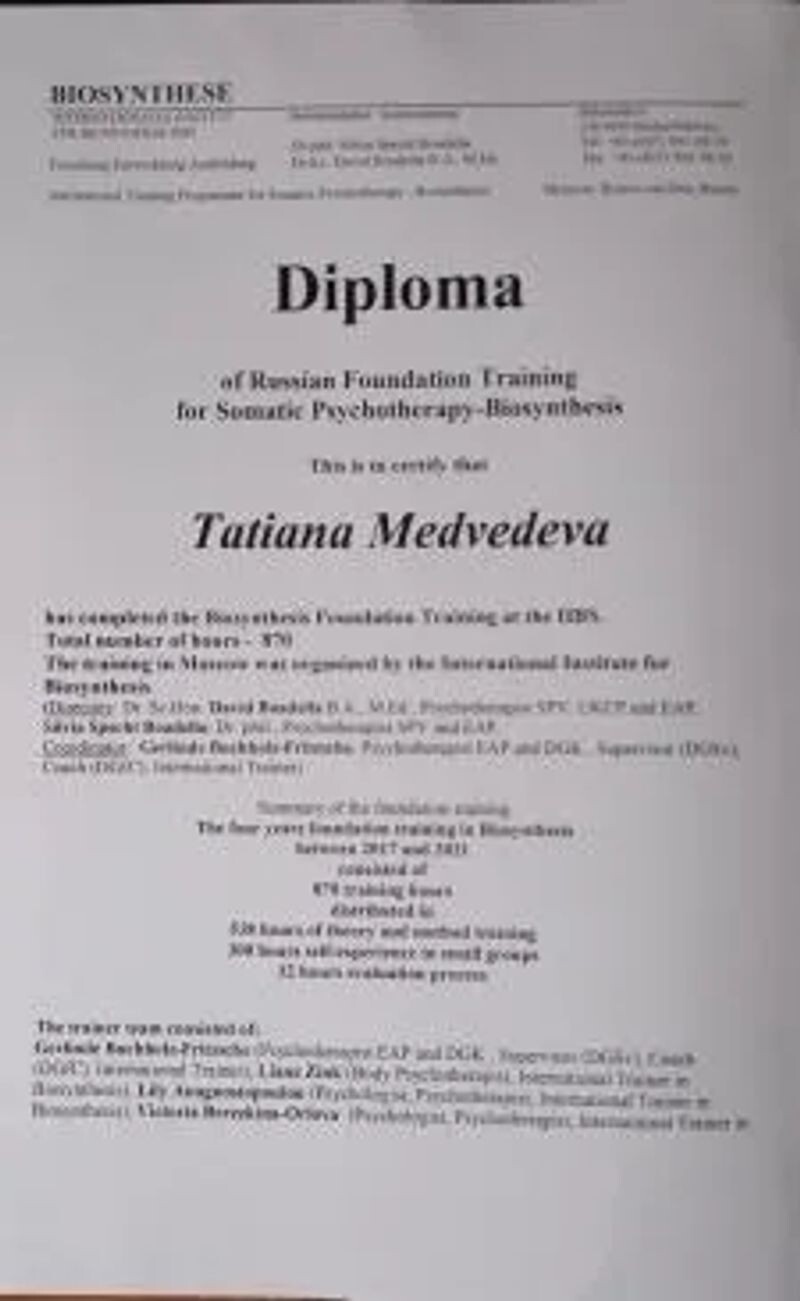 - Диплом EABS (Европейской ассоциации биосинтеза), Российского институт биосинтеза. International Long-term program for Somatic Therapy-Biosynthesis, 2017–2021 гг.