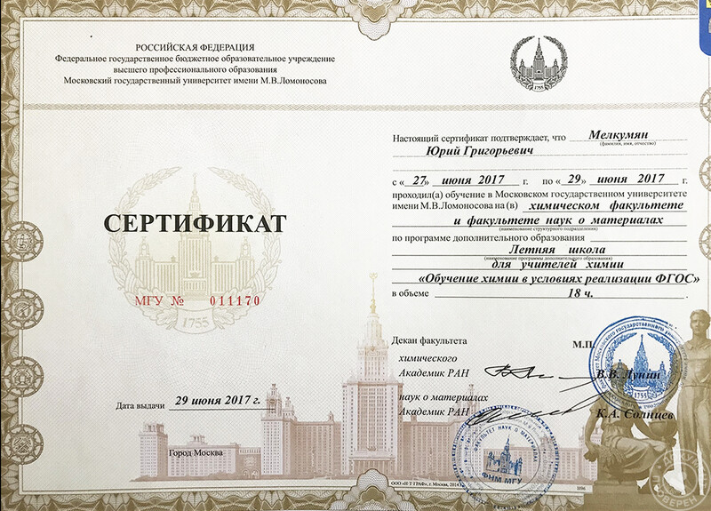 - МГУ им. М.В. Ломоносова, сертификат о прохождении обучения по программе дополнительного образования «Летняя школа для учителей химии», курс «Обучение химии в условиях реализации ФГОС» (2017 г.).