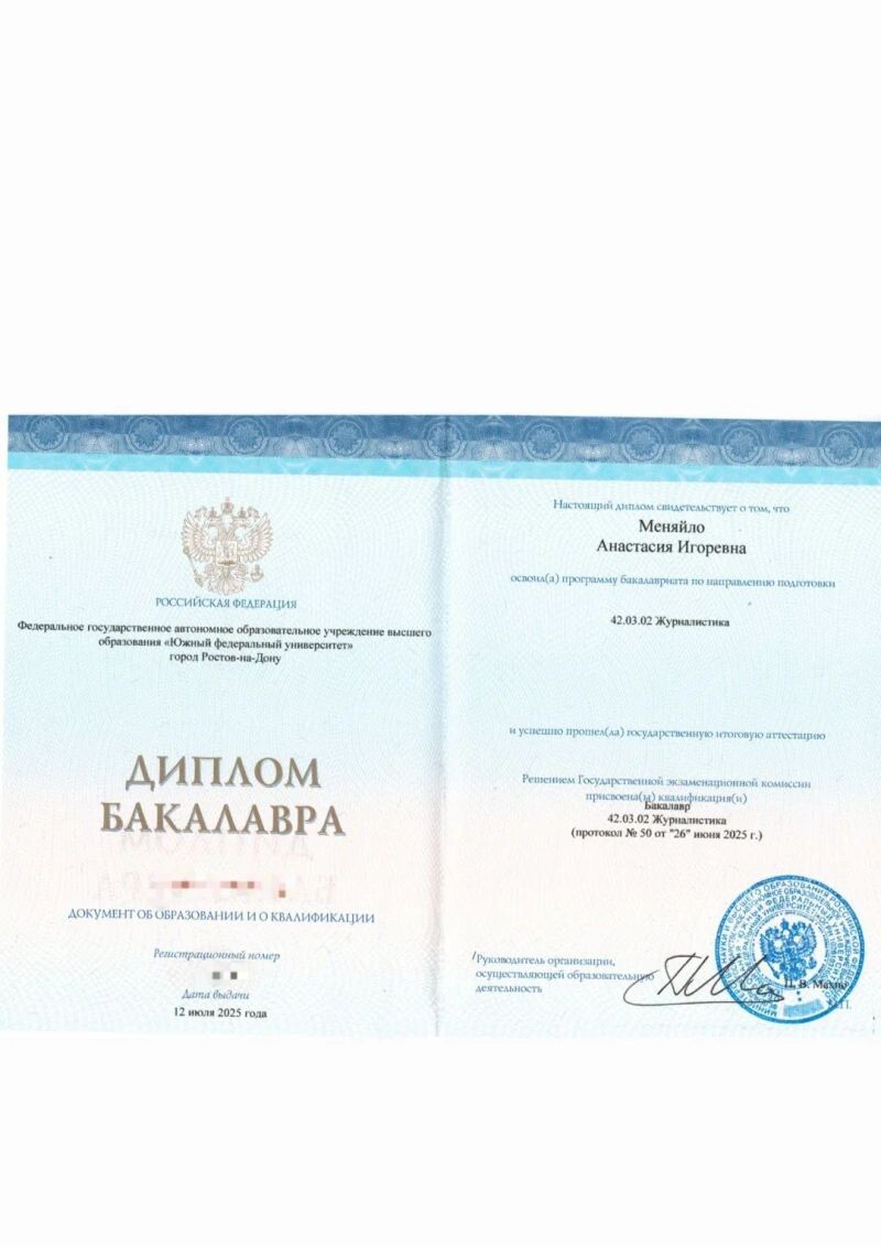 - Южный Федеральный Университет. Институт филологии, журналистики и межкультурной коммуникации. Журналистика, 2021–2025 гг.
