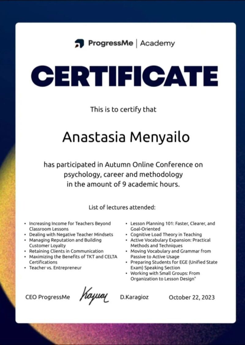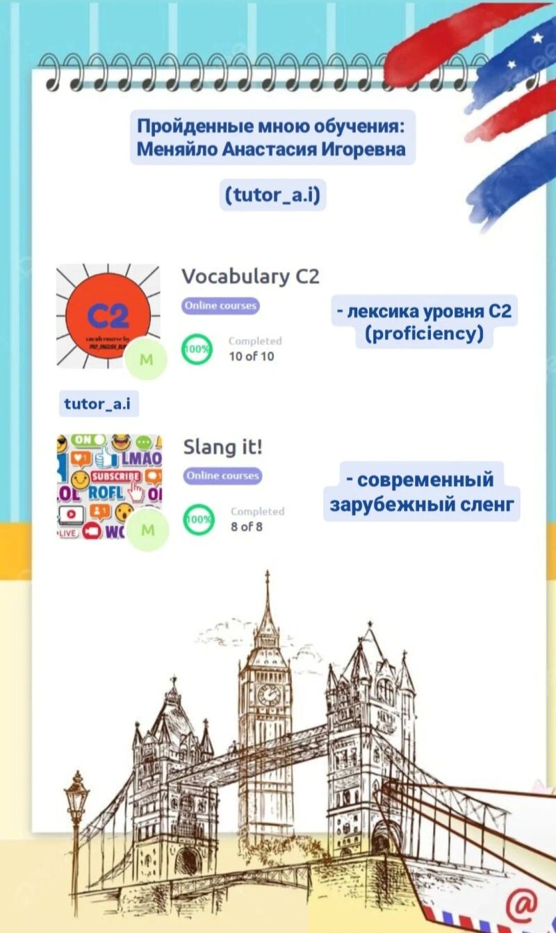 - Обучение по лексике уровня С2 (Proficiency) в объёме 10 уроков, которое было пройдено в "Blin!Academy" Обучение по современному зарубежному сленгу в объёме 8 уроков, которое было пройдено в "Blin!Academy" (с 2025 г.).