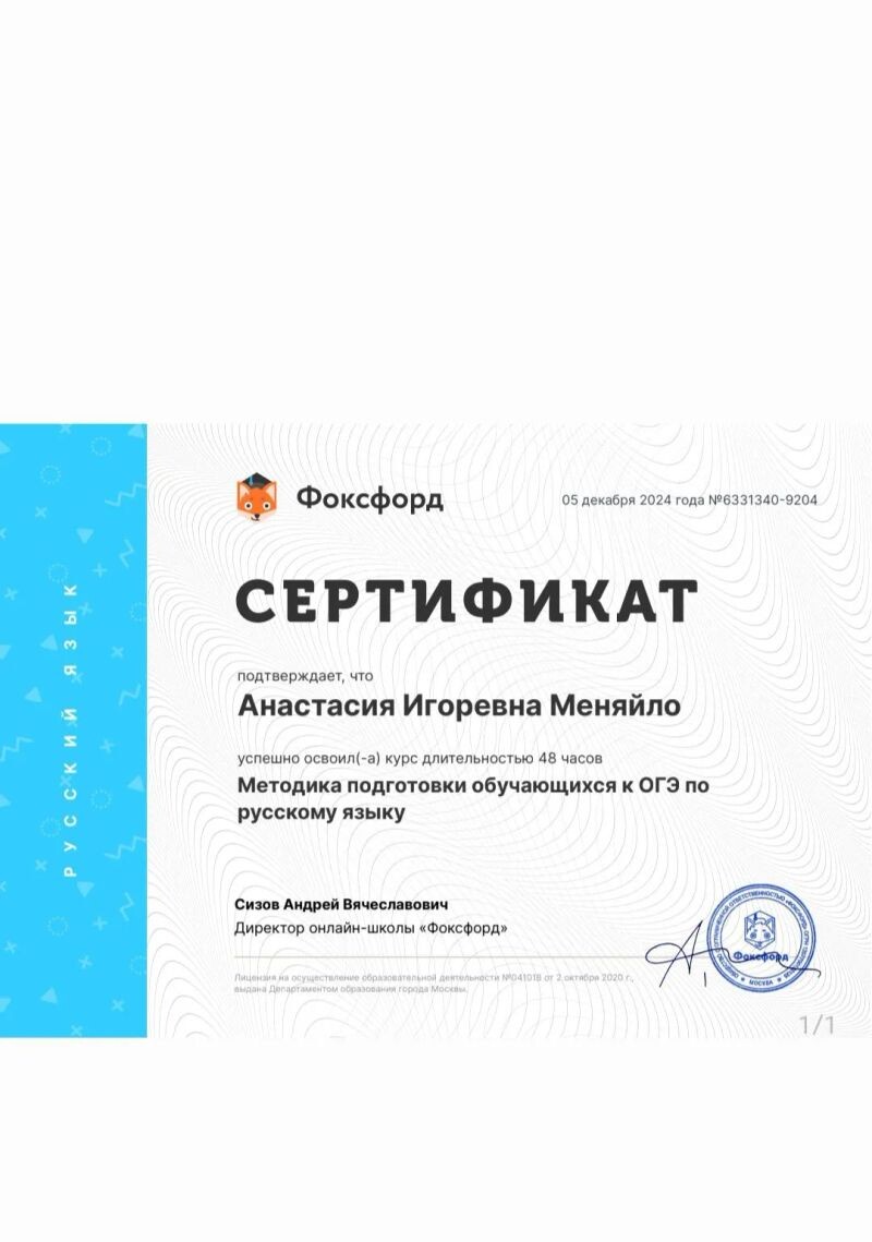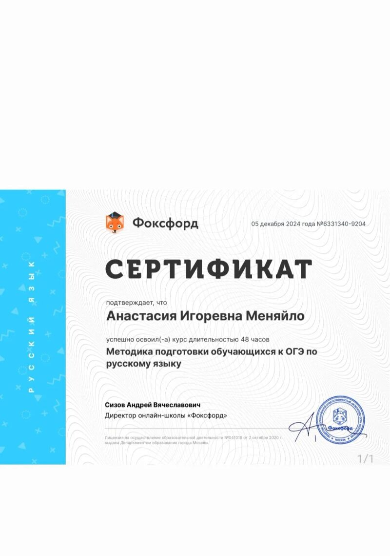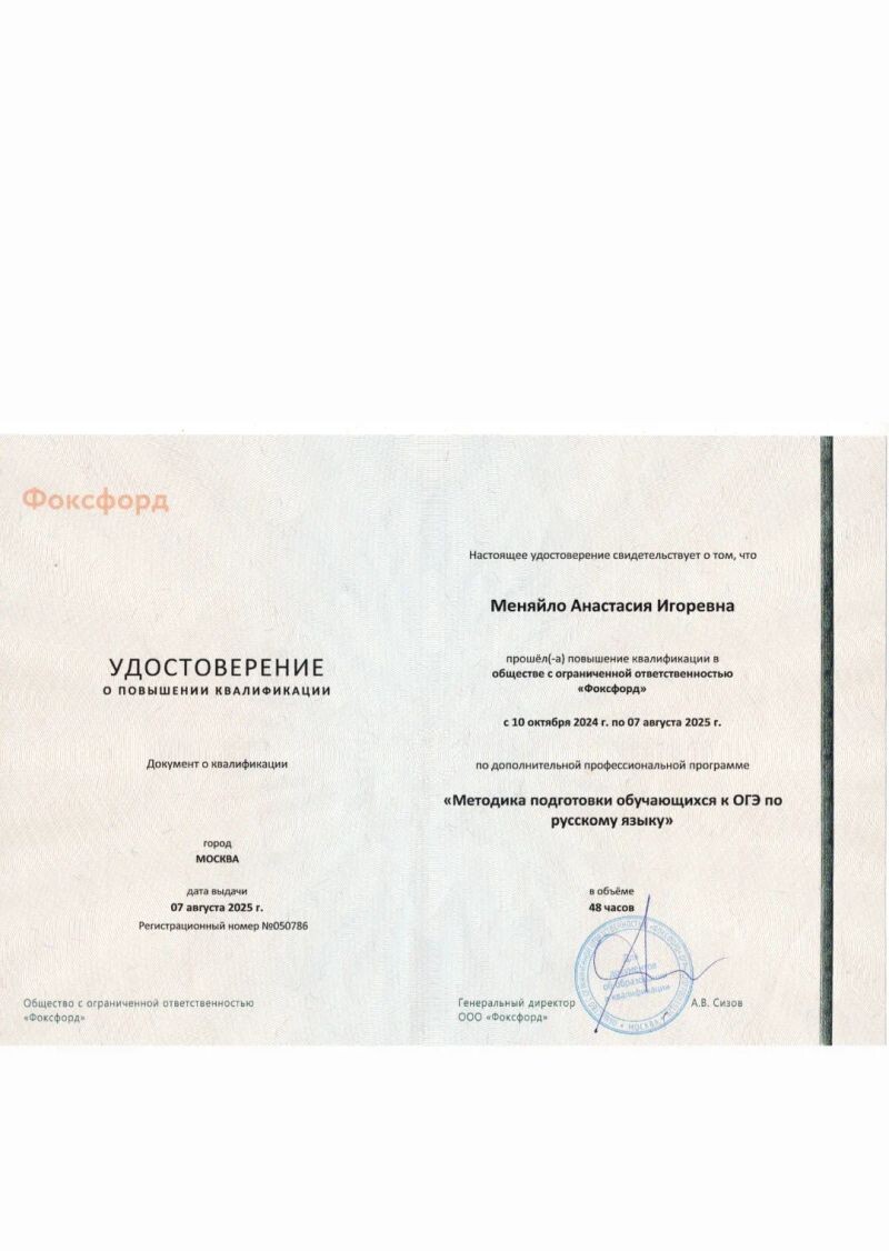 - Удостоверение о повышении квалификации по русскому языку: "Методика подготовки обучающихся к ОГЭ по русскому языку" в объёме 48 часов, которое было пройдено в ООО "Фоксфорд" (с 2025 г.).