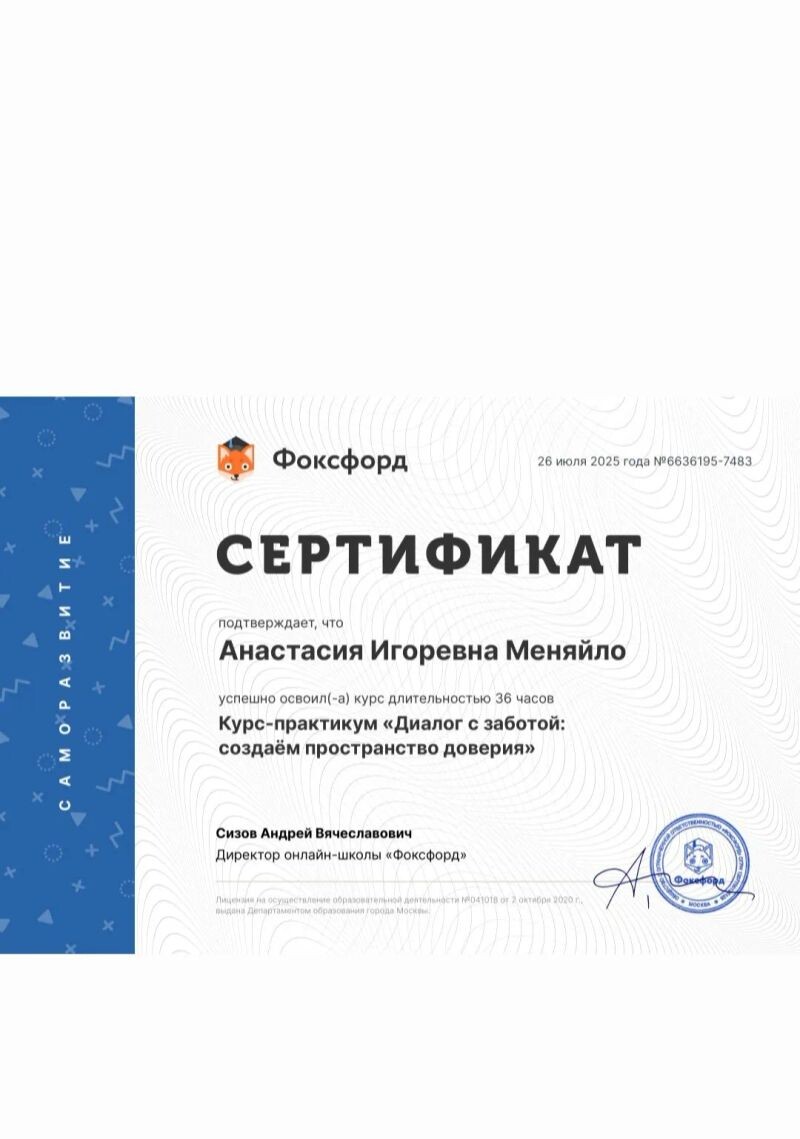 - Курс-практикум "Диалог с заботой: создаём пространство доверия" в объёме 36 часов, который был пройден в "Фоксфорд" (с 2025 г.).