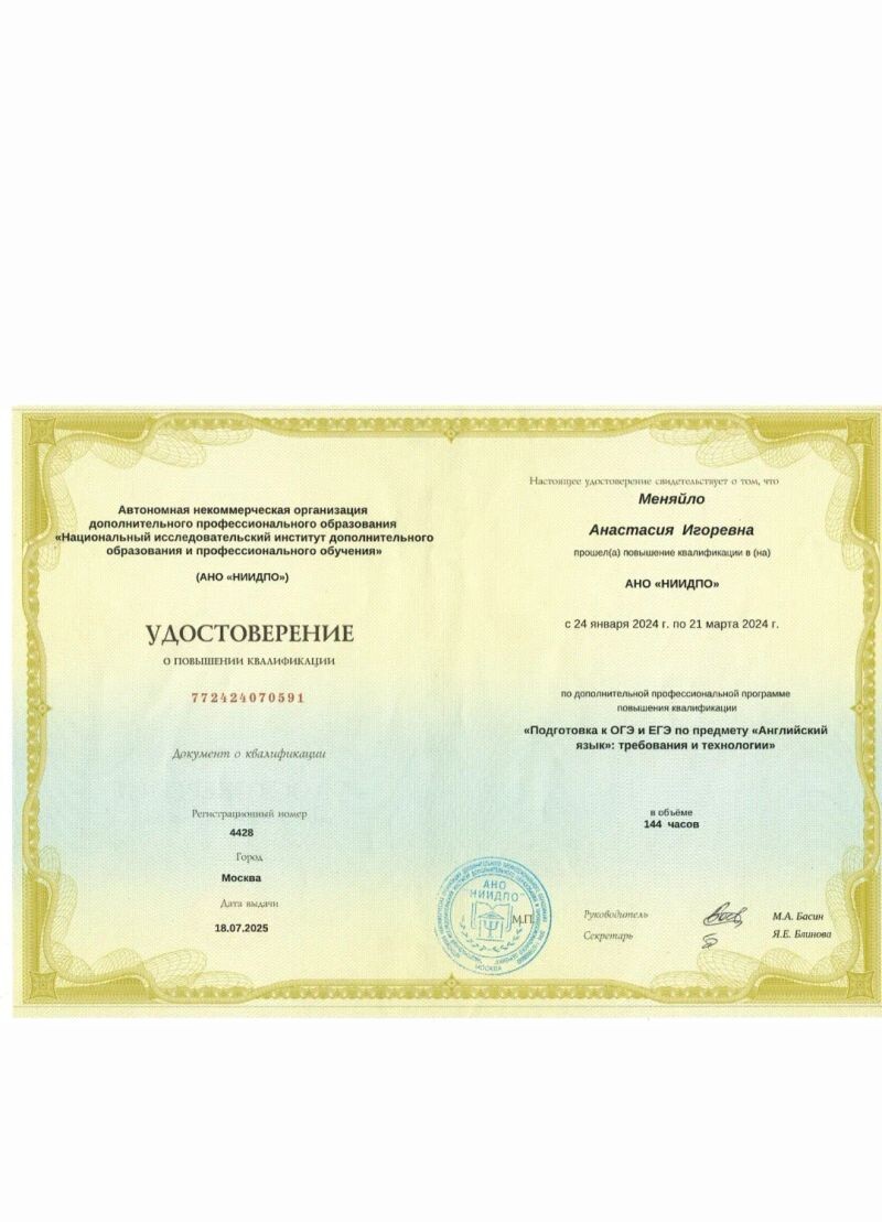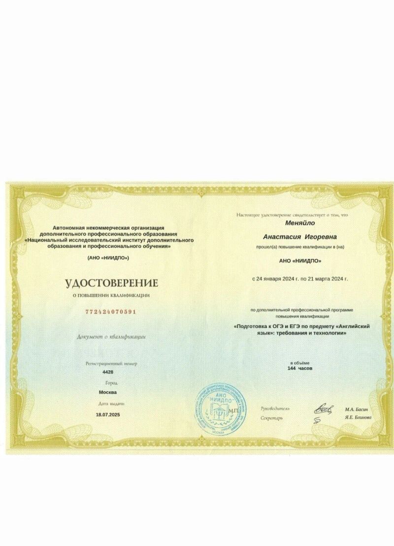 - Удостоверение о повышении квалификации: "Подготовка к ОГЭ и ЕГЭ по предмету "Английский язык" требования и технологии" в объёме 144 часов, которое было пройдено в НИИ ДПО (с 2025 г.).