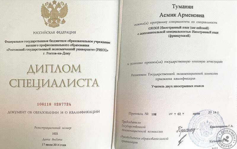 - Выпускница Ростовского государственного экономического университета, факультет иностранных языков, специальность – учитель двух иностранных языков (английский и французский), 2014 г.