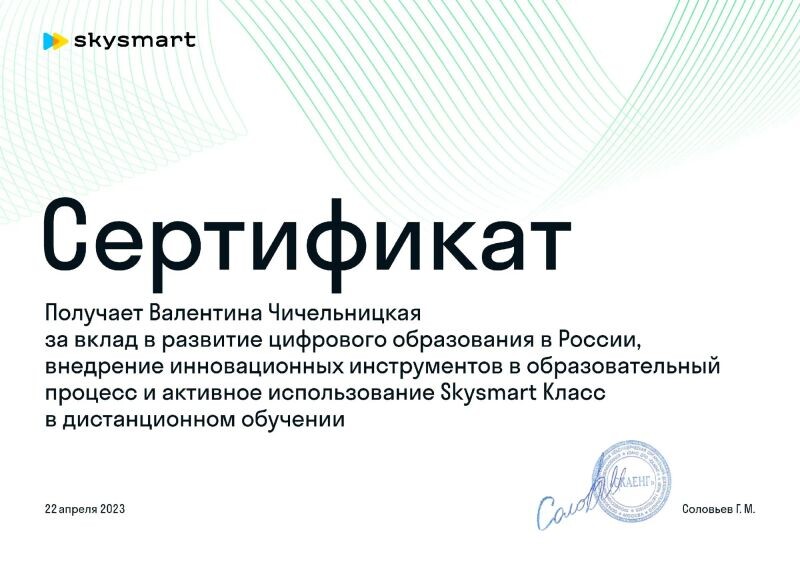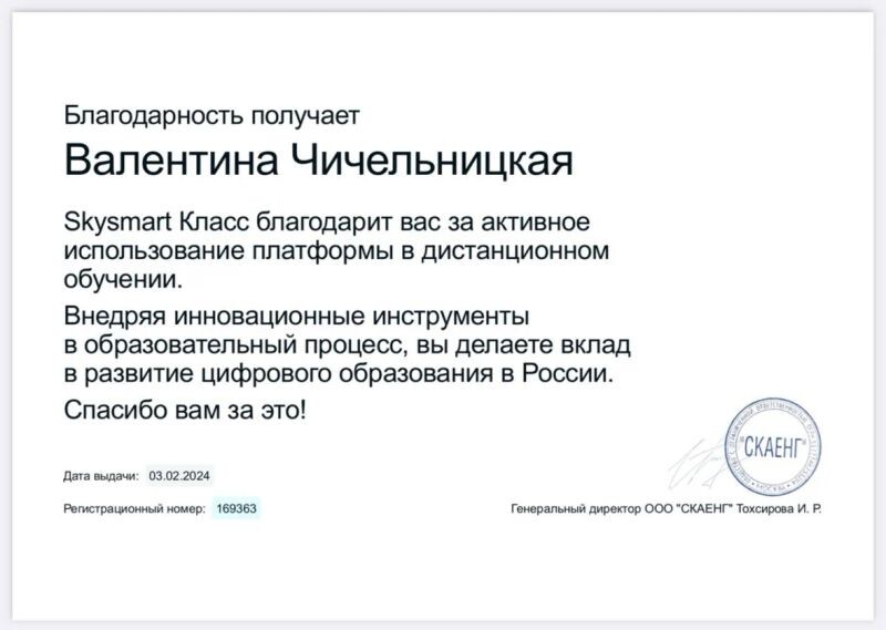 - Skysmart Класс, благодарность за активное использование платформы в дистанционном обучении, 2024 г.