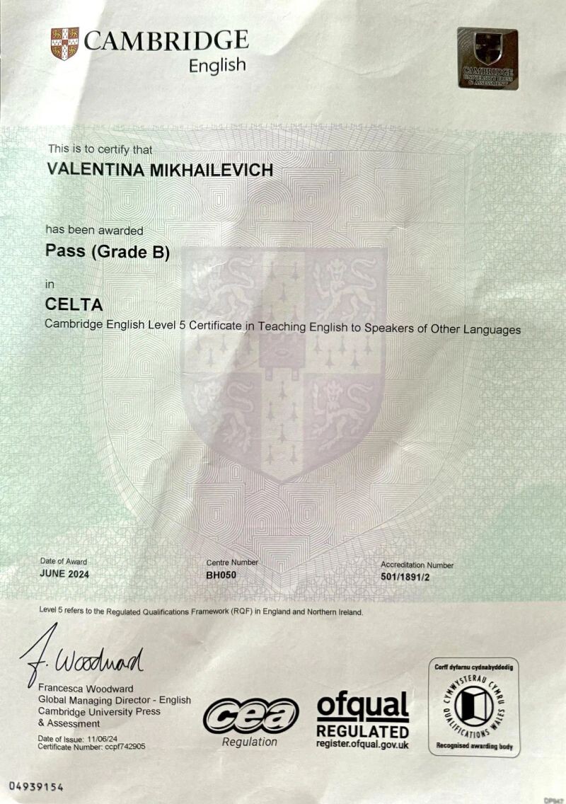 - Кембриджские сертификат CELTA (Grade B), 2024 г.