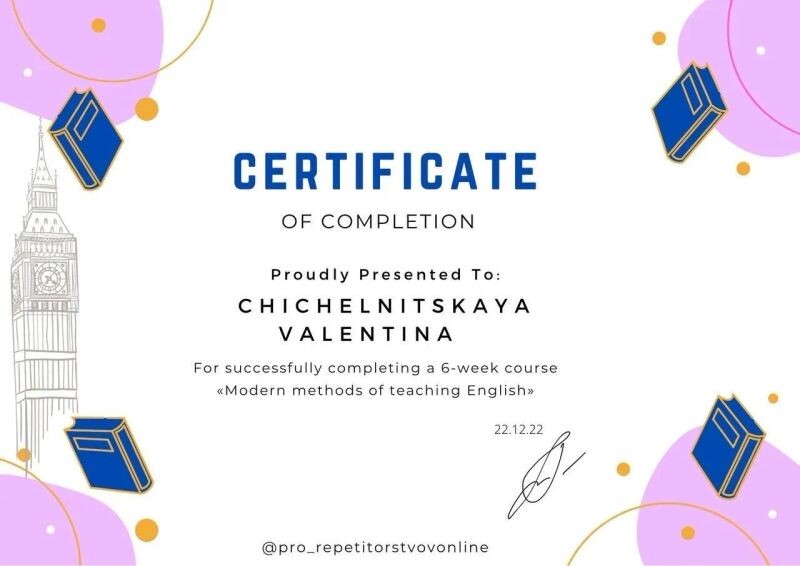 - ProRepetitor, курс «Современные методы преподавания английского языка», 2022 г.