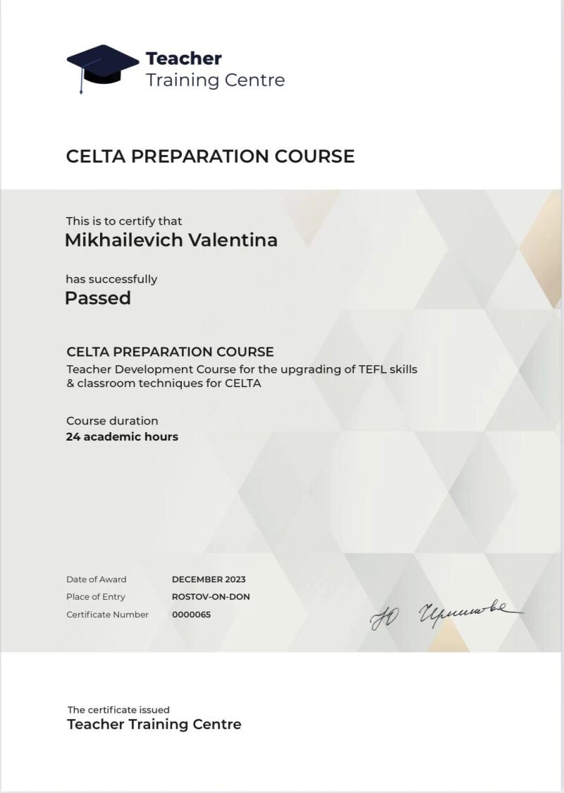 - Teacher Training Centre, CELTA preparation course, 2023 г.