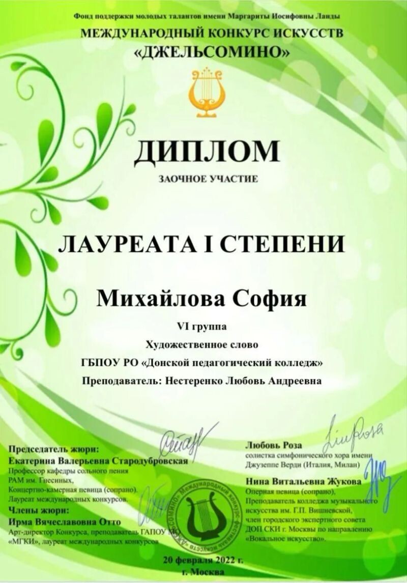- Международный конкурс искусств «Джельсомино», лауреат I степени, 2022 г.