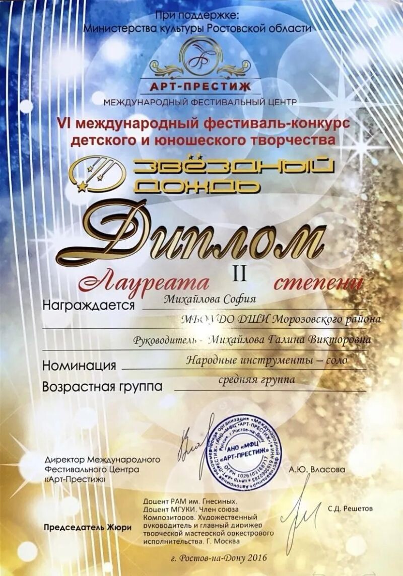 - Международный фестивальный центр «Арт-Престиж», лауреат II степени VI международного фестиваль-конкурса детского и юношеского творчества «Звездный дождь», 2016 г.