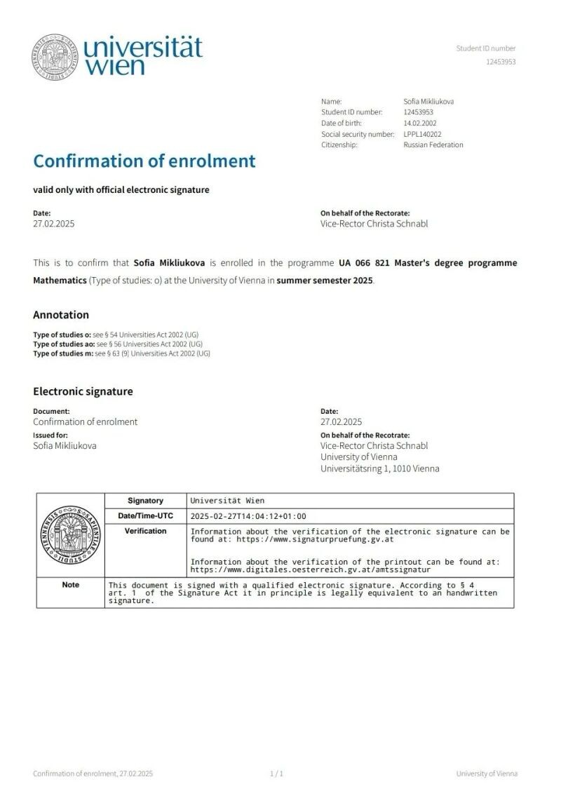 - Венский университет, магистратура по направлению "Математика" (обучение очное на английском языке) - Австрия, г. Вена (с 2025 г.).