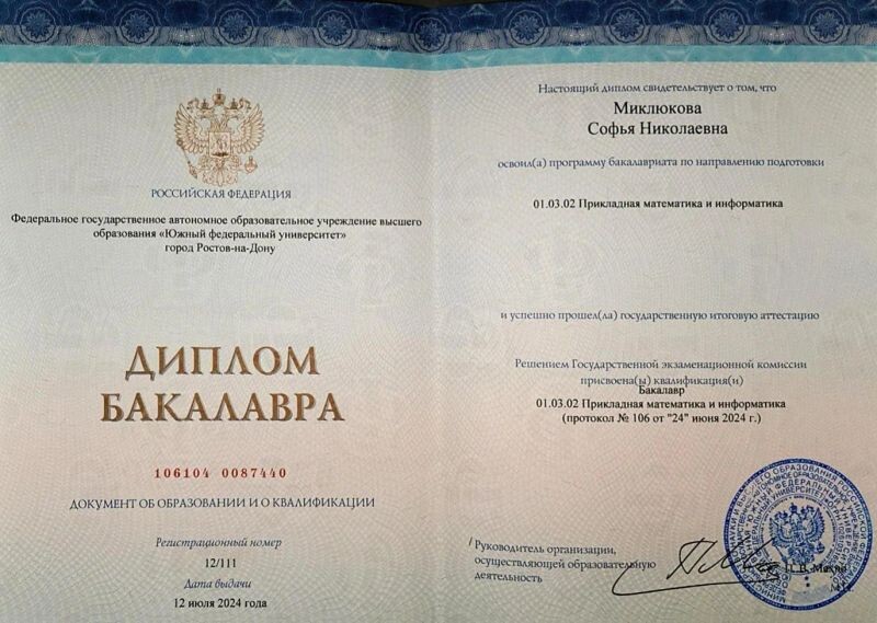 - Южный федеральный университет, прикладная математика и информатика, 2020–2024 гг.