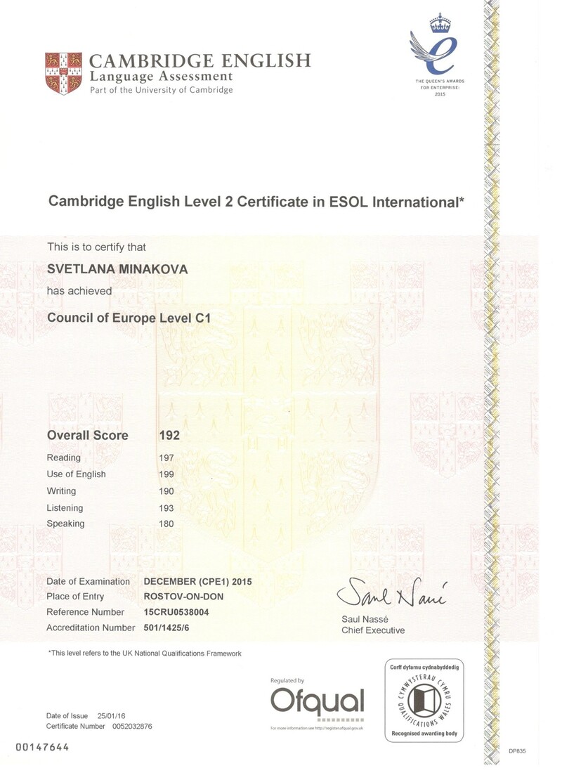 - Кембриджский сертификат уровня С1, 2015 г.
