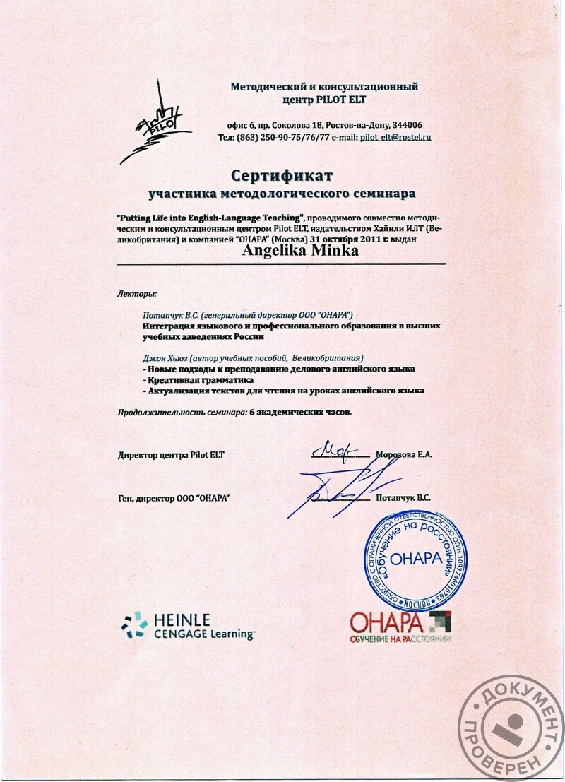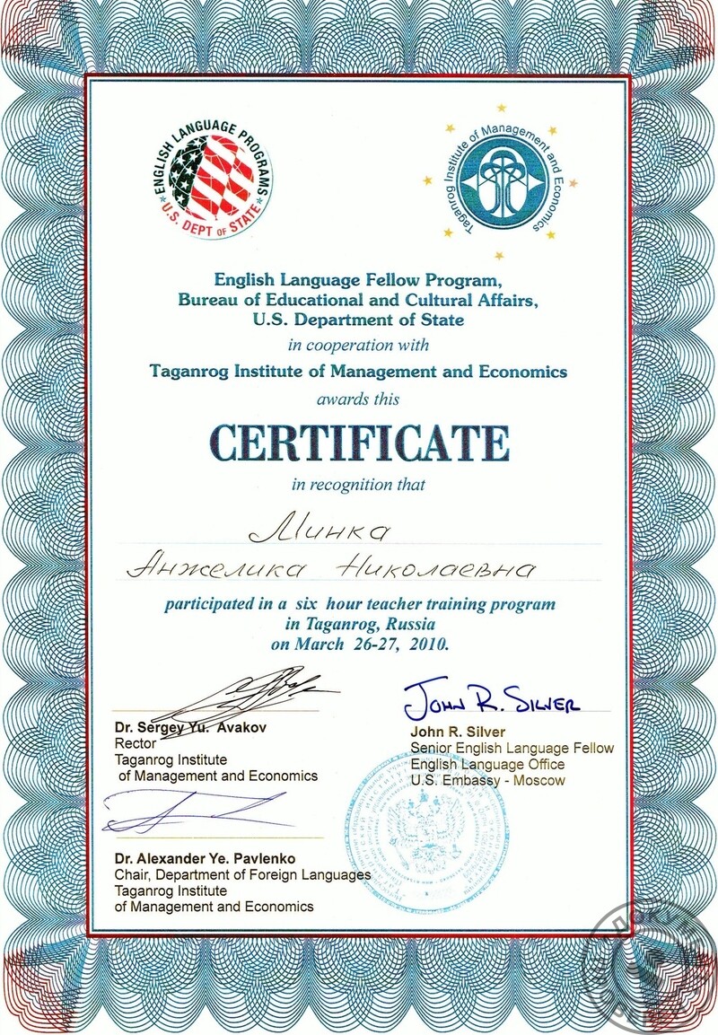 - Таганрогский государственный лингвистический университет, факультет переводоведения, специальность – лингвистика, перевод, 1998 г.