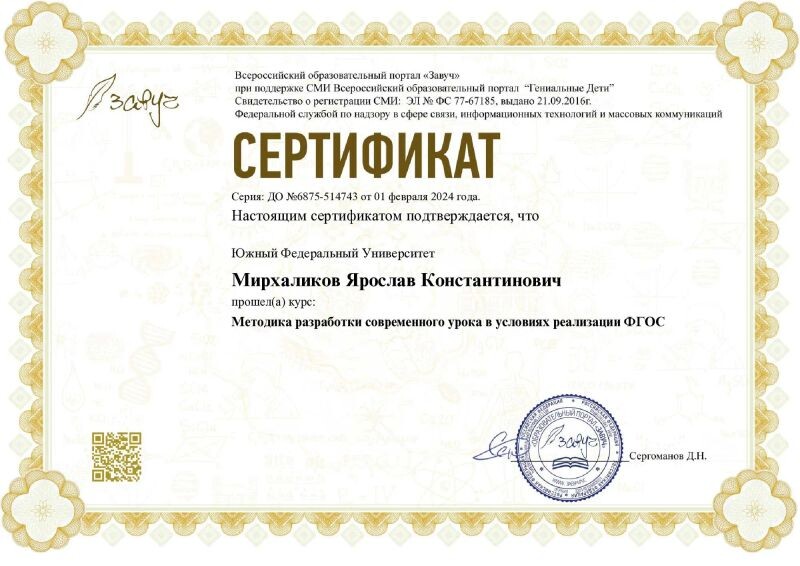 - Всероссийский образовательный портал «Завуч», курс «Методика разработки современного урока в условиях реализации ФГОС», 2023–2024 гг.