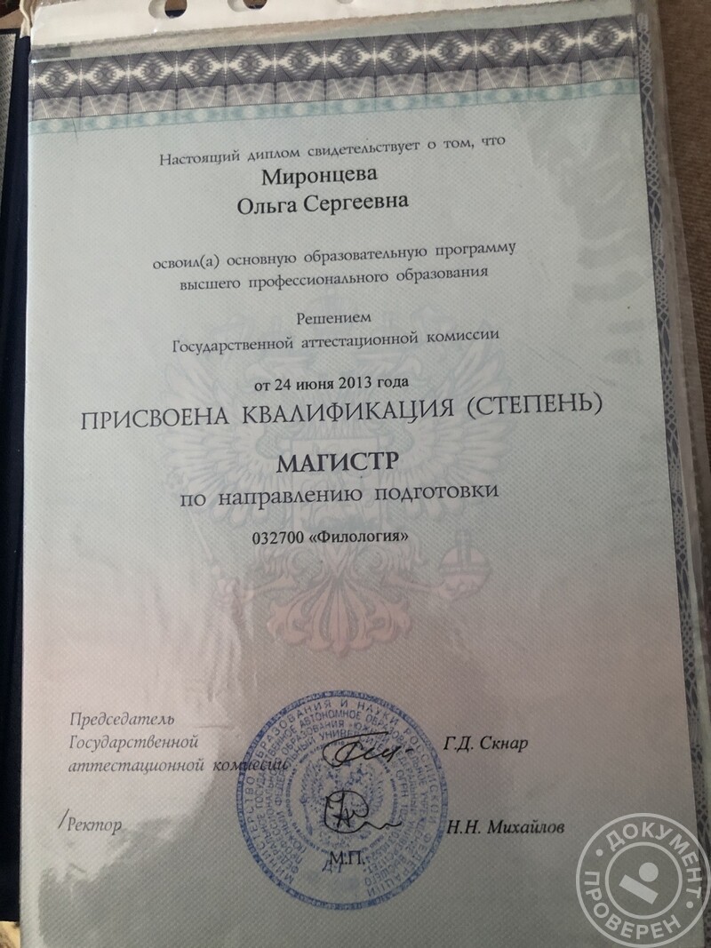 - Южный федеральный университет, факультет филологии и журналистики, кафедра английской филологии (магистр, 2013 г.).