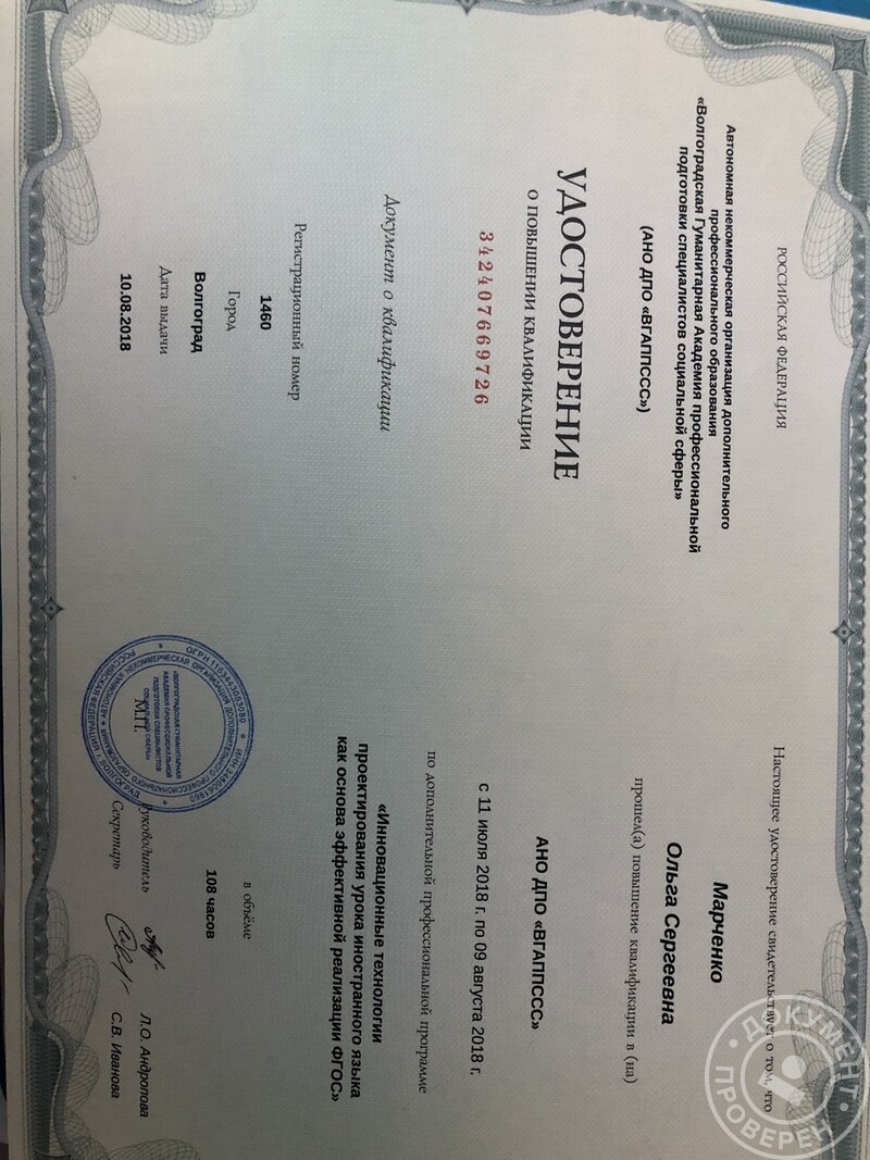 - АНО ДПО «ВГАППССС», повышение квалификации по программе «Инновационные технологии проектирования урока иностранного языка как основа эффективной реализации ФГОС», 2018 г.