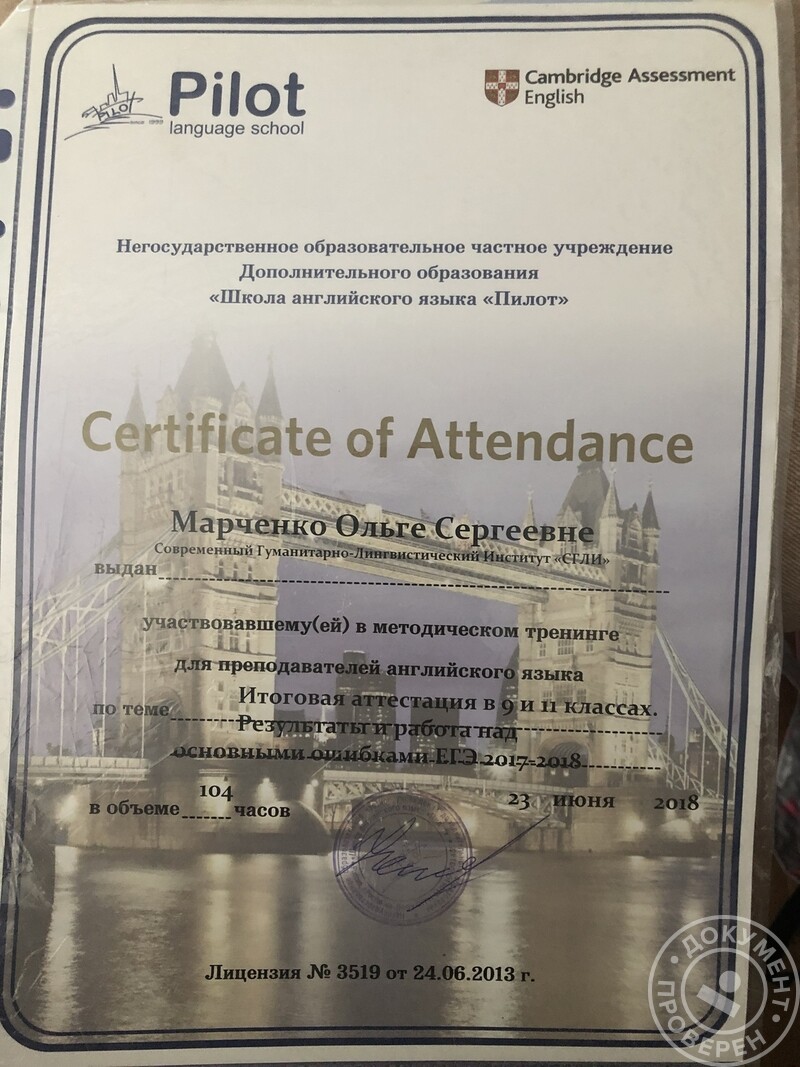 - Школа английского языка «Пилот», сертификат участника методического тренинга на тему «Итоговая аттестация в 9 и 11 классах», 2018 г.