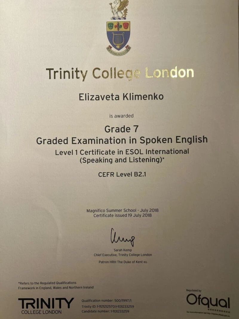 - Trinity College London Certificate in ESOL International (Speaking and Listening) CERF Level B2.1 (с 2018 г.).