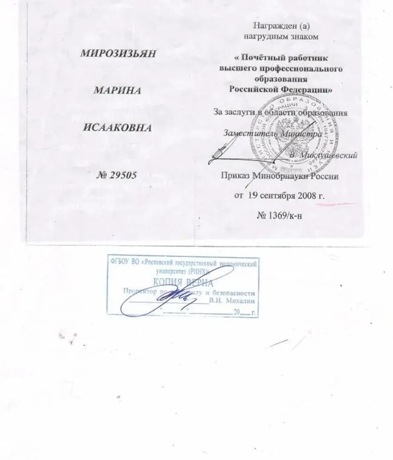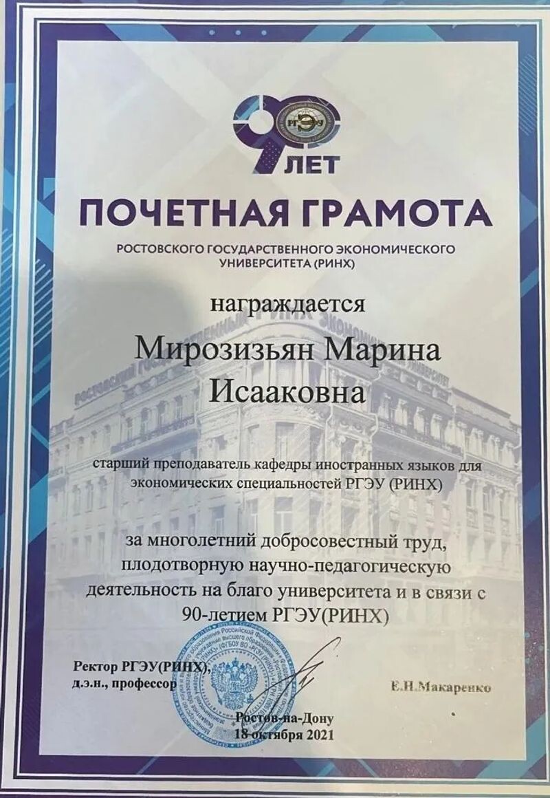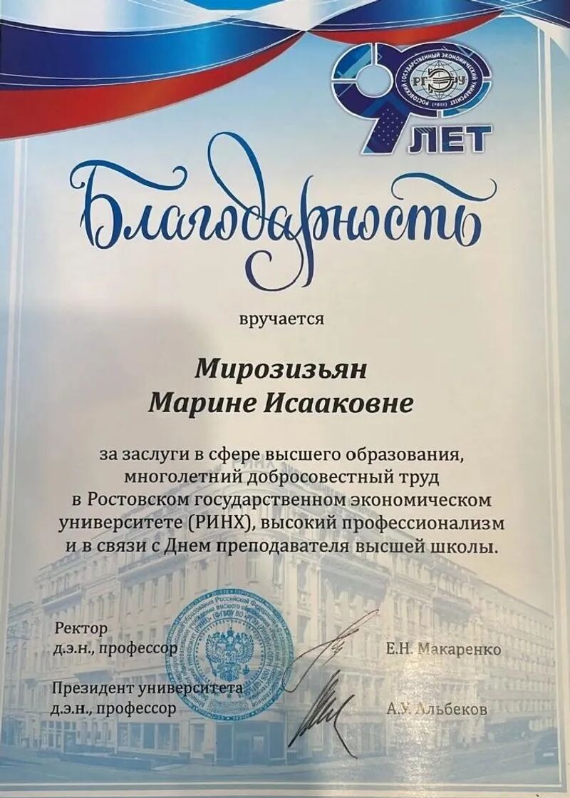 - Ростовский государственный экономический университет (РИНХ), почётная грамота за многолетний добросовестный труд и плодотворную научно-педагогическую деятельность на благо университета, 2021 г.
