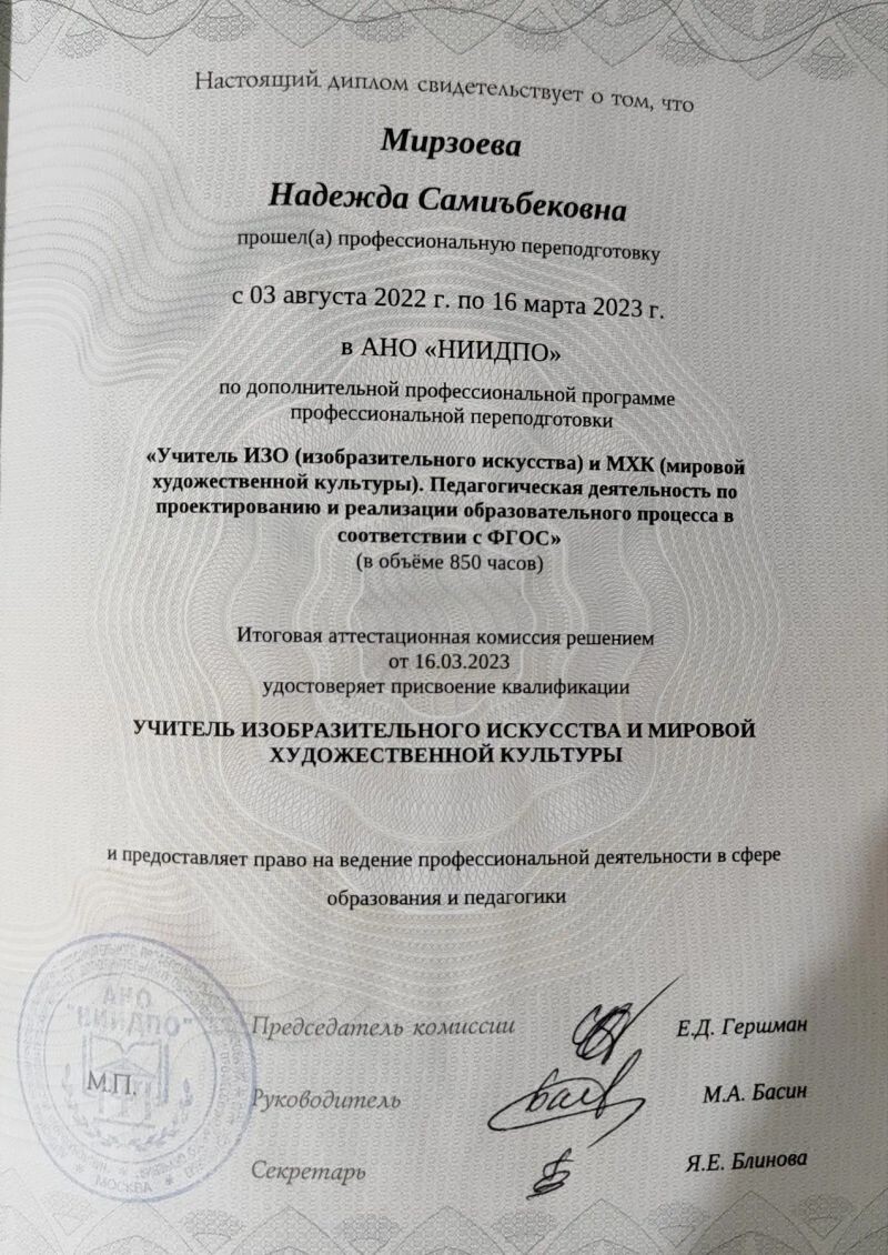 - АНО «НИИДПО», учитель ИЗО и МХК, 2022–2023 гг.