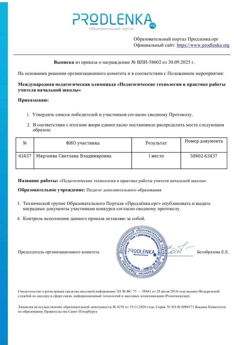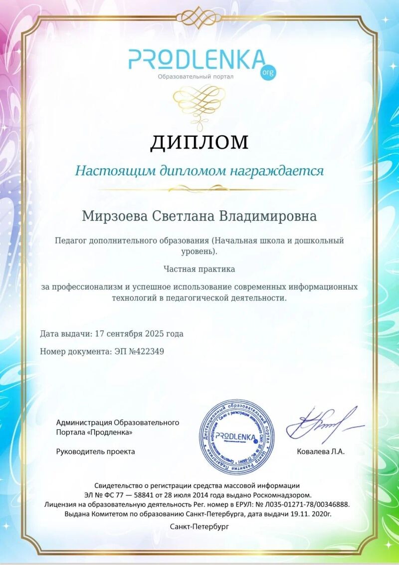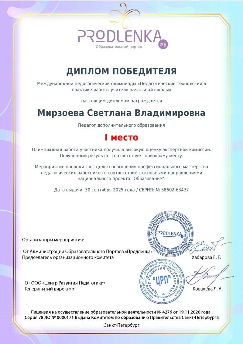 - Диплом победителя в международной педагогической олимпиаде "Педагогические технологии в практике работы учителя начальной школы" (с 2025 г.).