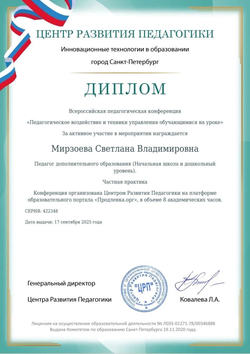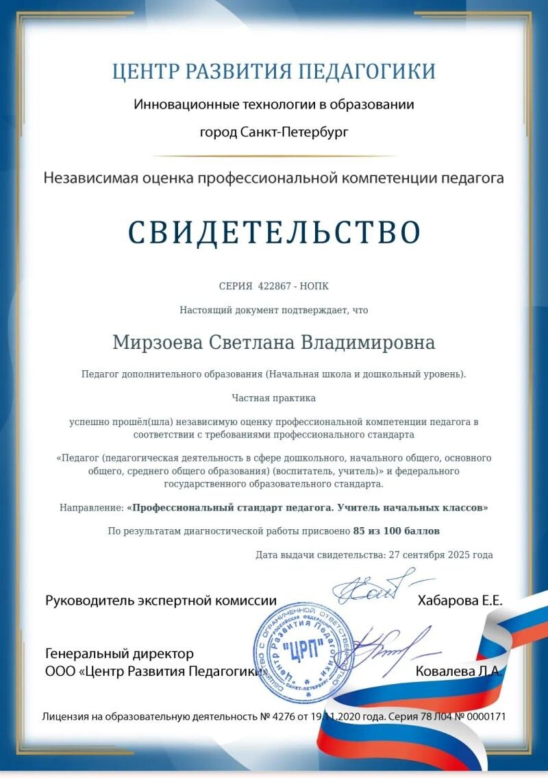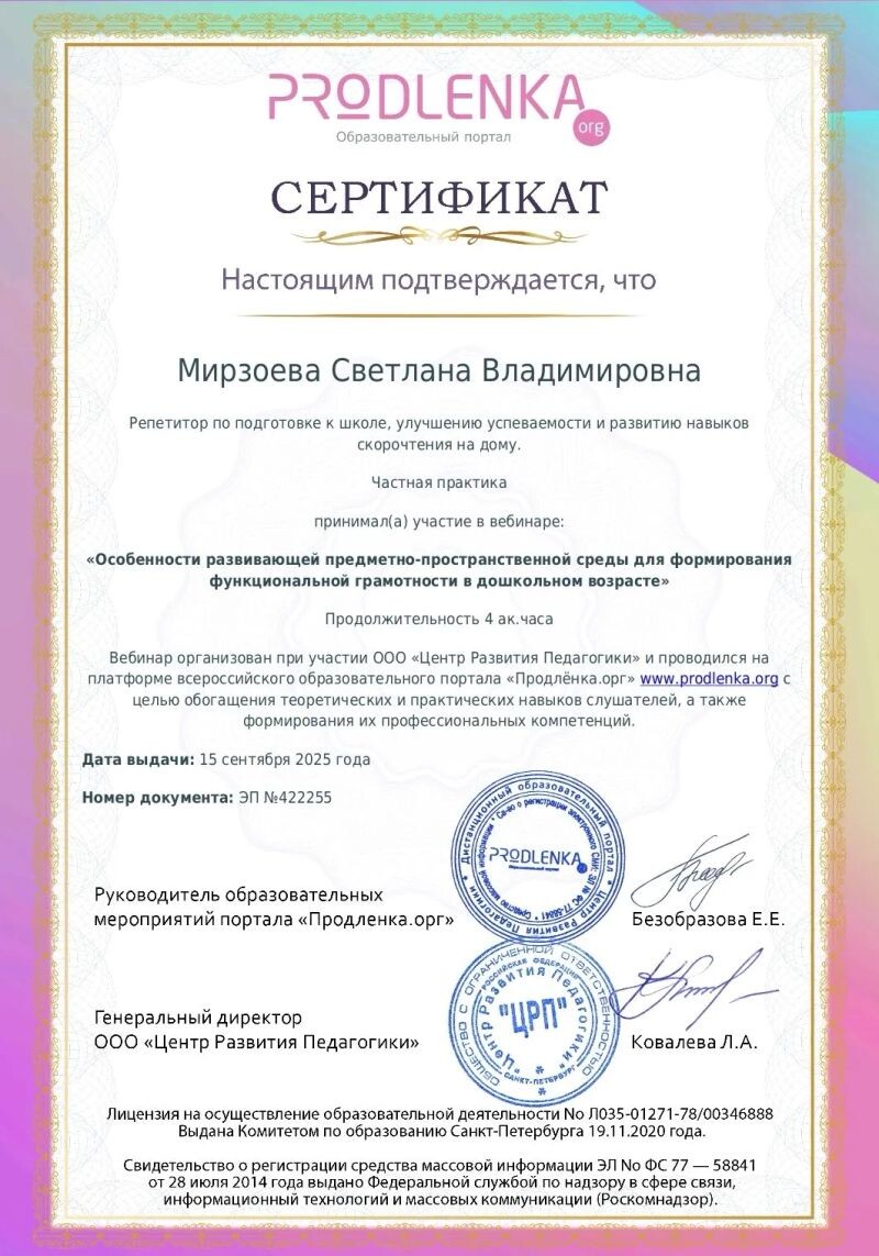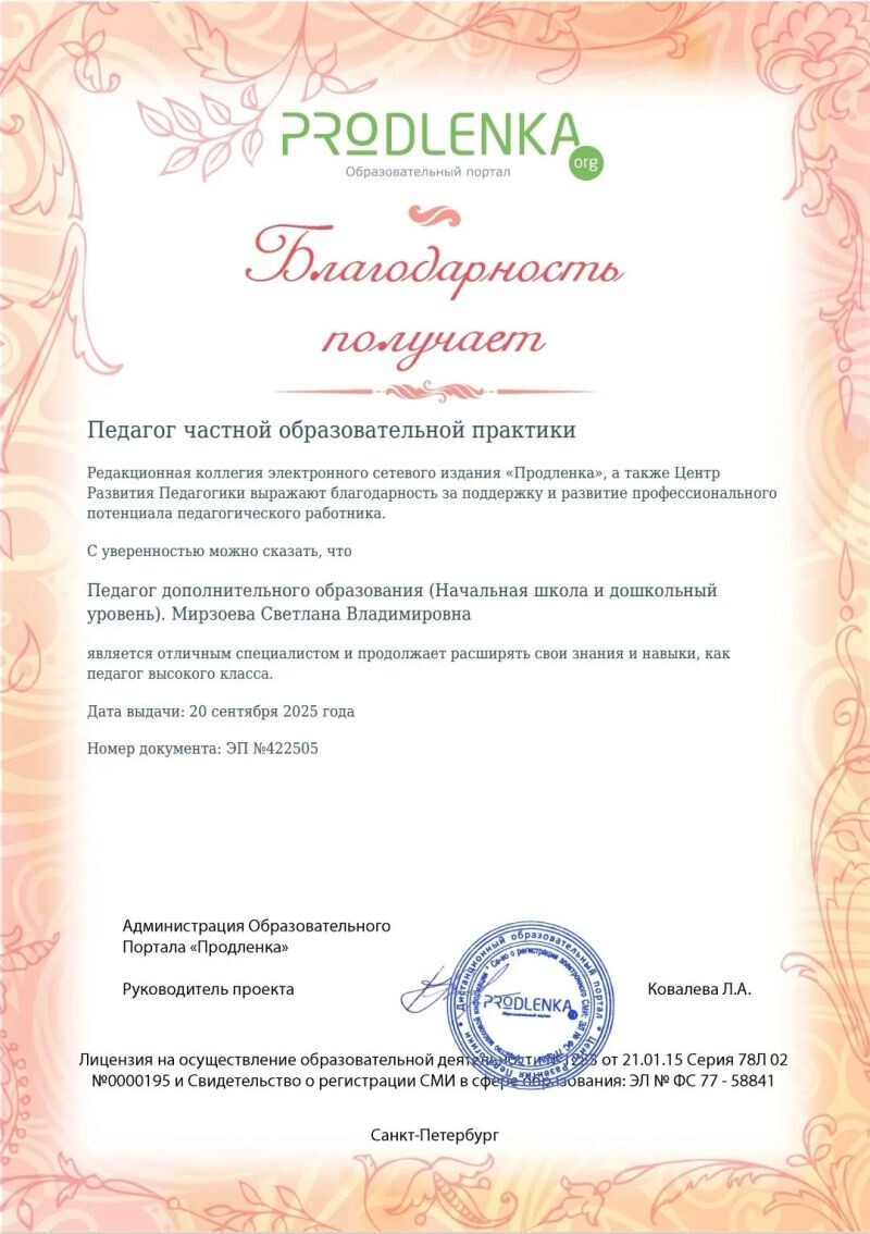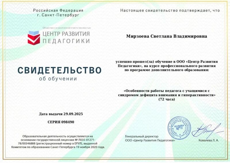 - Свидетельство о прохождении обучения курсов повышения квалификации "Особенности работы с учащимися с синдромом дефицита внимания" (с 2025 г.).
